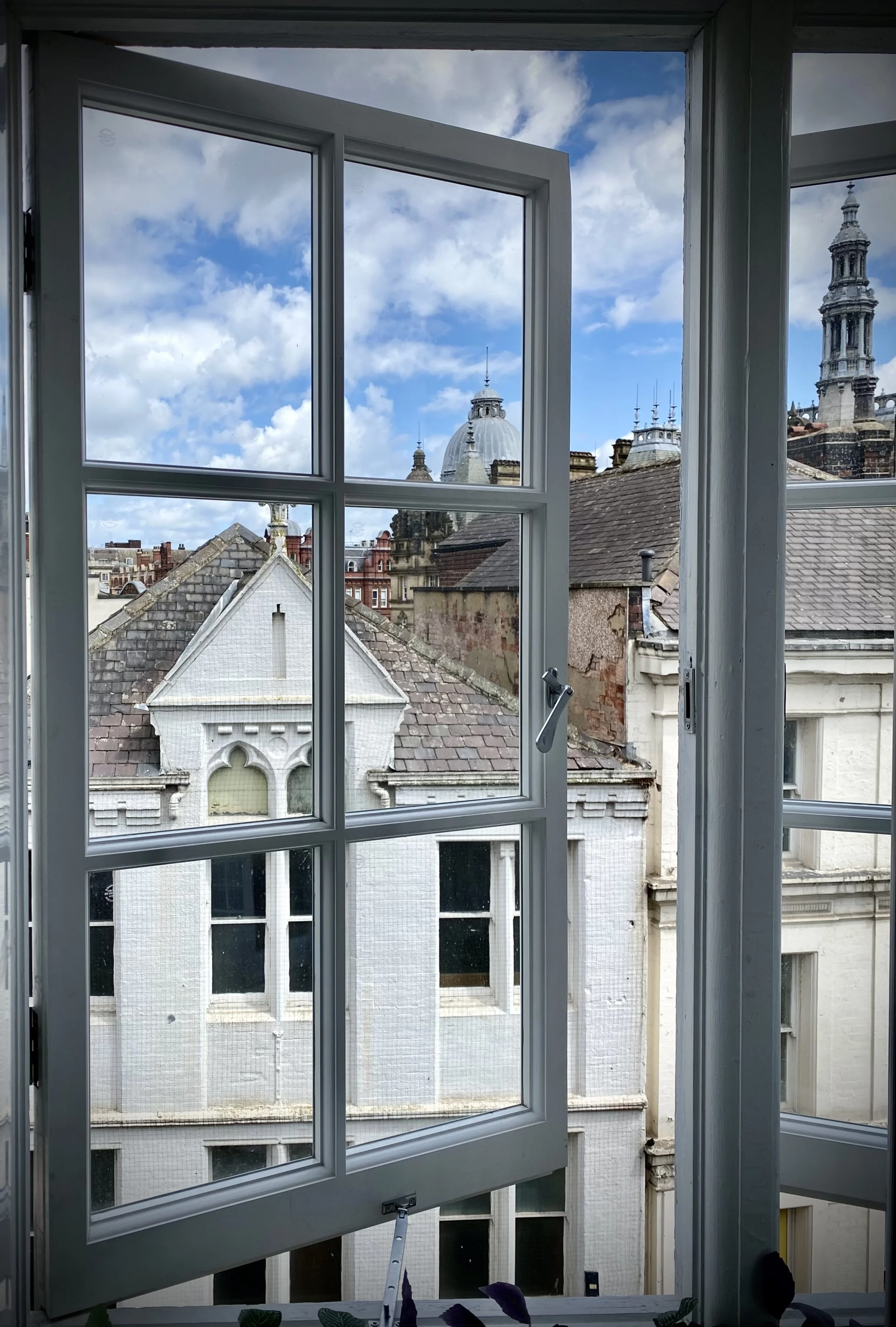 This morning I am sitting at a kitchen table in a quiet upper story apartment in Leeds. I am keeping company with a pair of pigeons and a silent army of stone spires lining the lichen-covered slate rooftops just over the narrow cobble lane below my window. Outside, I hear the morning noise of cities the world over - busses, demolition, the whine of a drill, the slightly frenzied stop and go of traffic.